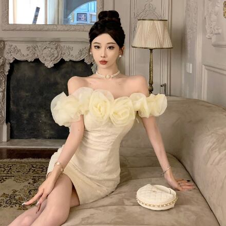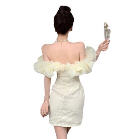 レディース スカート ワンピース ドレス ショート 膝上 袖なし オフショルダー タイト 切り替え 背中開き フリル ふわふわ ハイウエスト 薄手 ポリエステル かわいい 大人可愛い きれいめ シンプル 上品 おしゃれ ガーリー エレガント 主役級 存在感 ラブリー キュート プリンセス 都会的 シック 無地 夏 結婚式 披露宴 発表会 ママ 10代 20代 発表会 コンサート 美脚 脚長 S M L 黒 アプリコット