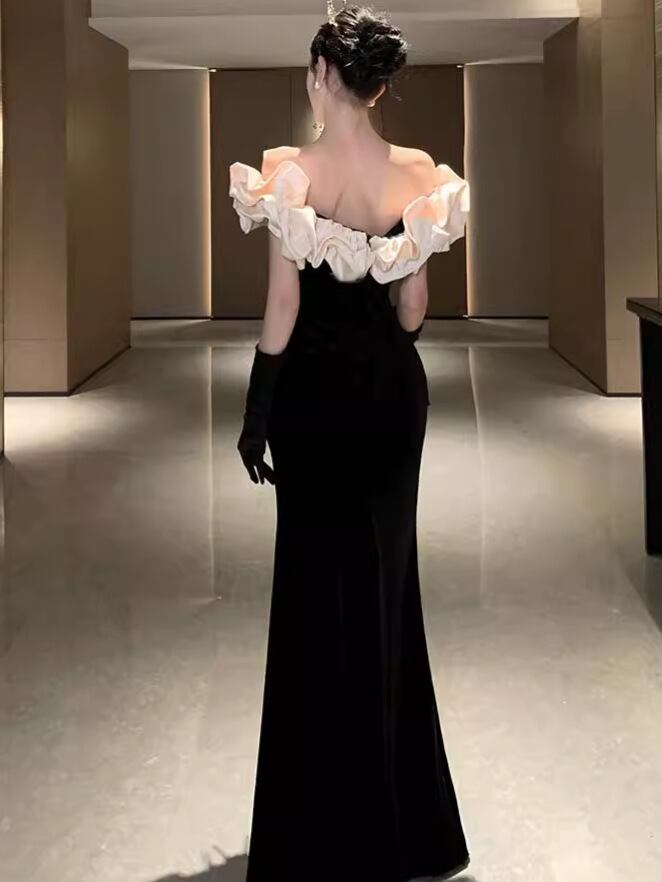 ドレス パーティー 披露宴 演奏会 発表会 ロング 袖なし オフショル マーメイド スリム プリーツ ハイウエスト ベルベット スパンデックス 上品 おしゃれ エレガント 存在感 無地 パーティー イベント 旅行 秋 冬 S M L XL 2XL ブラック レッド