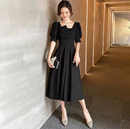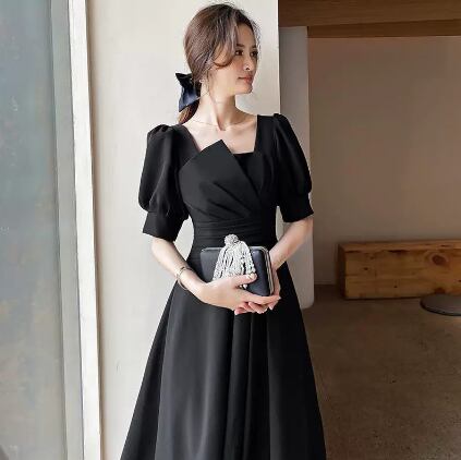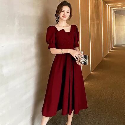 レディース スカート ドレス フレア ドレス 膝下 7分丈 半袖 パフスリーブ レギュラースリーブ ラウンドネック 襟なし フレア 細身 切り替え プリーツ タックプリーツ ウエストマーク ファスナー ポリエステル かわいい 大人可愛い きれいめ シンプル 上品 おしゃれ エレガント 都会的 無地 夏 入学式 入園式 卒業式 卒園式 結婚式 発表会 授業参観 10代 20代 30代 パーティー コンサート 脚長 S M L XL 黒 ワインレッド
