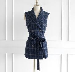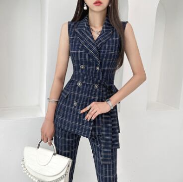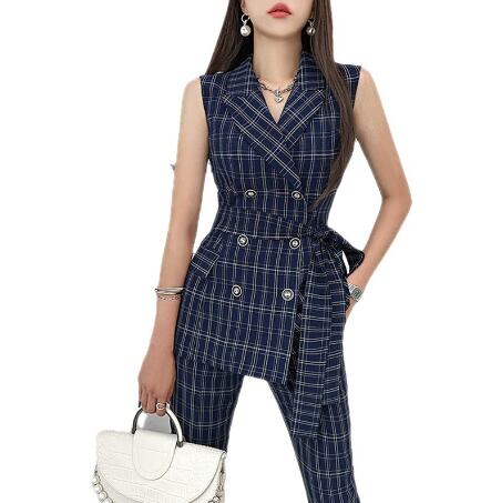 レディース トップス パンツ セットアップ アンクル丈 袖なし ノースリーブ Vネック 襟付き 角襟 ボタンダウン タイト スリム 細身 ストレート ベルト ウエストマーク ハイウエスト 前開き ボタン ポリエステル 大人可愛い シンプル 上品 おしゃれ クール かっちり チェック 夏 10代 20代 30代 オフィス ビジネス OL 通勤 デート お出かけ イベント リゾート レストラン ビーチ ホテル コンサート ライブ 重ね着 美脚 脚長 インスタ映え S M L XL 青×白チェック柄