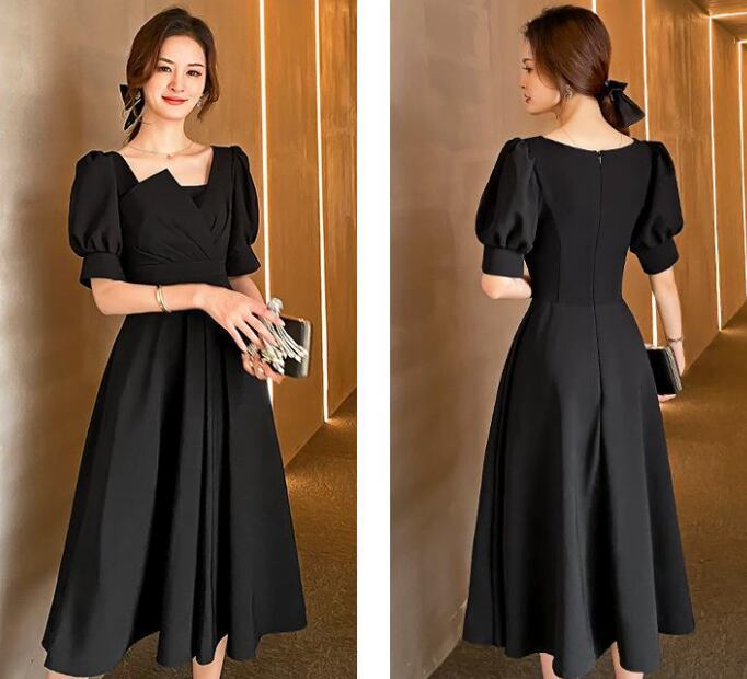 ドレス ワンピース パーティー 演奏会 発表会 ステージ 舞台 膝下 半袖 スクエアネック アシンメトリー Aライン プリーツ ファスナー ハイウエスト ポリエステル繊維 上品 おしゃれ エレガント 存在感 フォーマル 清楚 無地 パーティー イベント リゾート ホテル 春 夏 S M L XL 2XL ブラック バーガンディ