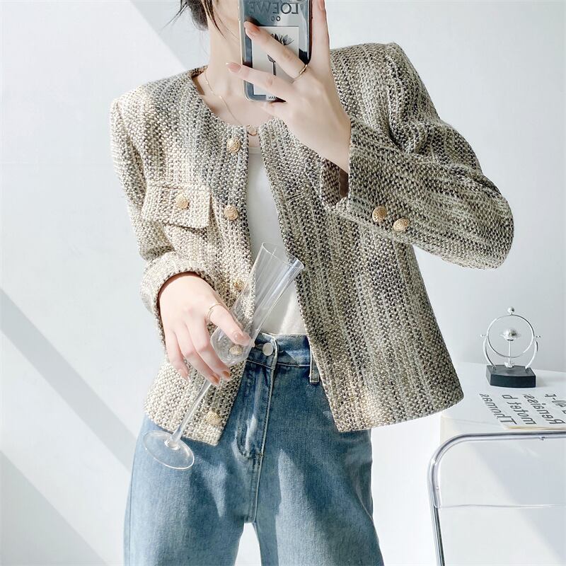 洗練された印象を与えるノーカラーデザインのレディースジャケット。ラウンドネックと前開き仕様が上品さを引き立て、羽織るだけで大人可愛いスタイルを演出します。