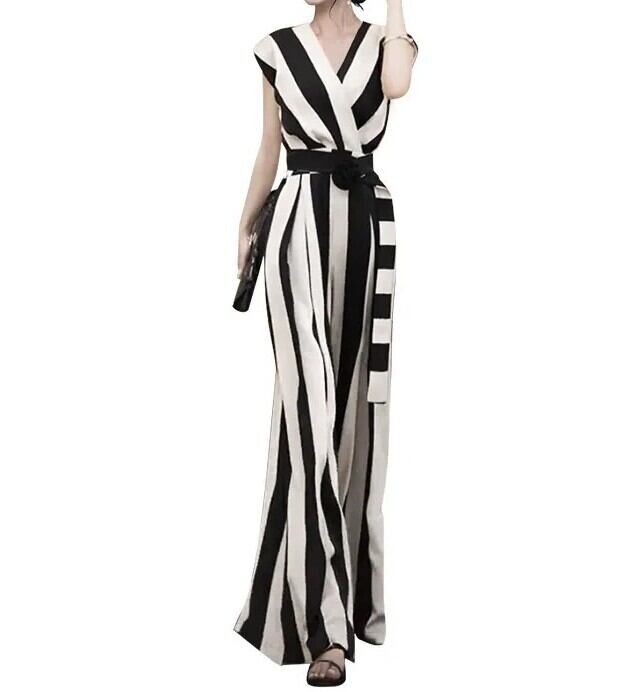 洗練された印象を与えるドレスジャンプスーツが登場です。特にウェディングやパーティー、結婚式、披露宴、演奏会など、華やかなシーンでの活躍が期待できます。ノースリーブのデザインにVネックを採用し、ハイウエストのシルエットが美脚効果を引き立て、女性らしさを際立たせています。大胆なストライプが目を引くスタイルで、上品かつおしゃれな雰囲気を演出します。