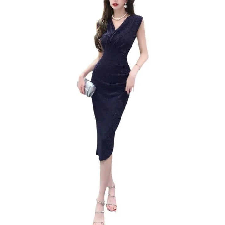 ドレス ワンピース ウェディング パーティー 結婚式 二次会 披露宴 演奏会 発表会 ステージ 舞台 フォーマル ラウンジ クラブ ミモレ ノースリーブ Vネック イブニング ハイウエスト きれいめ シンプル 大人可愛い 上品 おしゃれ かっこいい ガーリー クール エレガント 存在感 ゴージャス セクシー 無地 ホテル レストラン 韓国 美脚 脚長 高見え 格上げ 女子会 春 夏 秋 冬 シーズンレス S M L ブルー