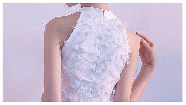 華やかなフレアシルエットが美しく広がり、アメリカンスリーブのホルターネックが上品な存在感を引き立てるロングドレスです。