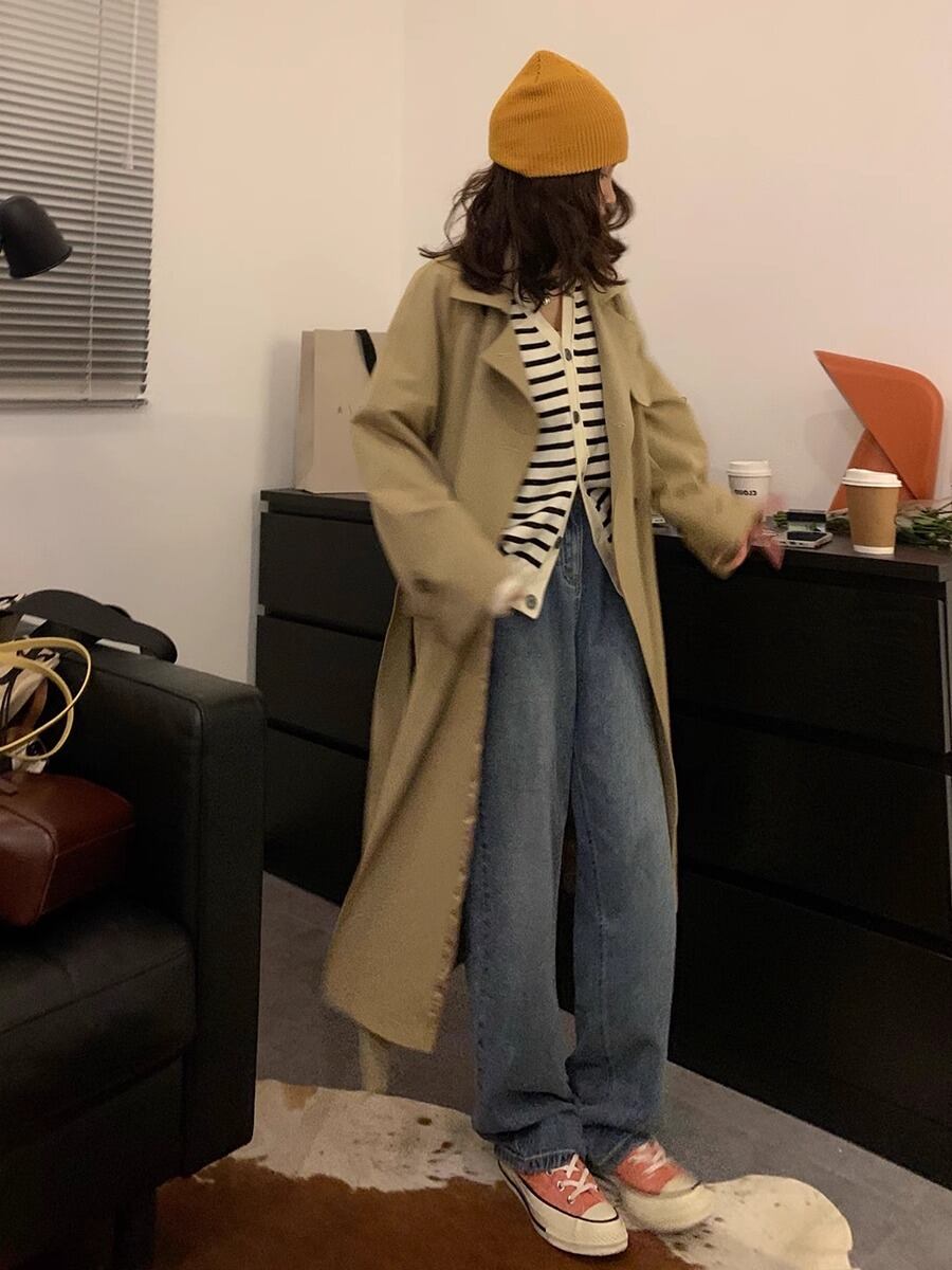 上品な角襟が印象的な膝下丈トレンチコートは、前開きデザインでさらりと羽織るだけでこなれ感を演出します。