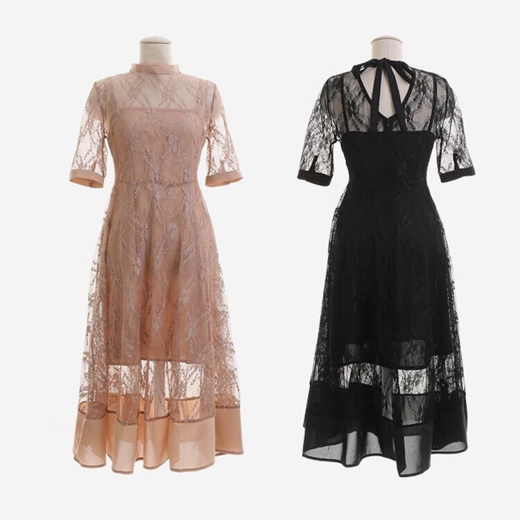 ドレス ワンピース ウェディング パーティー 結婚式 二次会 披露宴 演奏会 発表会 フォーマル 謝恩会 ラウンジ クラブ ミディアム丈 半袖 クルーネック レース ハイウエスト きれいめ シンプル 大人可愛い 上品 おしゃれ かっこいい ガーリー クール エレガント 存在感 無地 イベント ホテル レストラン 韓国 脚長 高見え 格上げ 女子会 春 夏 秋 冬 シーズンレス 大きい S M L XL ピンク ブラック