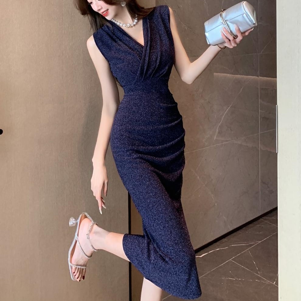 ノースリーブとVネックデザインが、首元をすっきりと見せ、美脚効果も抜群な一着です。