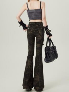 大人気のフルレングス・カーゴパンツ!ハイウエストデザインがスタイルを引き立て、魅力的なシルエットを作り出します。中厚手のデニム素材でしっかりとした履き心地ながらも、カジュアルかつ個性的な印象を与えます。迷彩柄がクールでアメリカンスタイルを演出し、デートやお出かけにぴったりです!特にアウトドアやキャンプ、女子会にもおすすめのアイテムです。ゆったりとしたシルエットとブーツカットのデザインが、美脚効果を高め、脚長に見せてくれます。