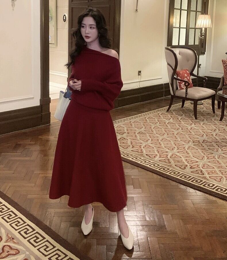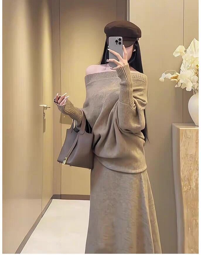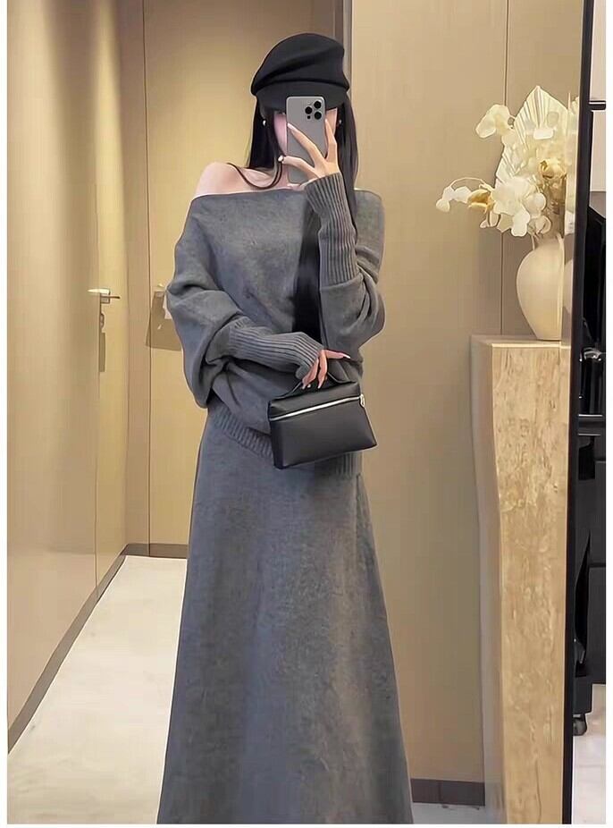 柔らかなニット素材で仕立てたトップスとスカートのセットアップが、秋冬の装いにほどよいこなれ感を添えます。オフショルダーやワンショルダーで着られるデザインとAラインのスカートがさりげなく女性らしさを演出します。