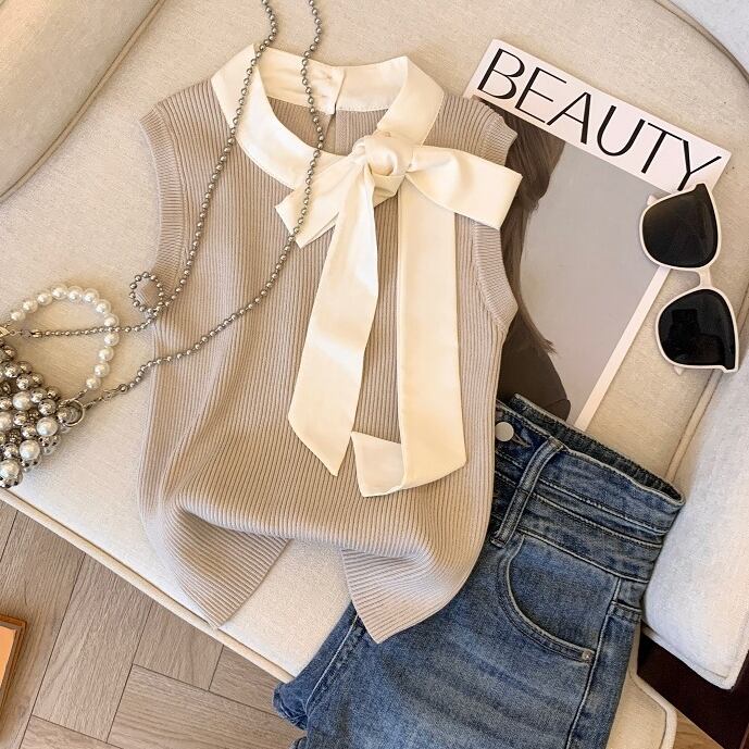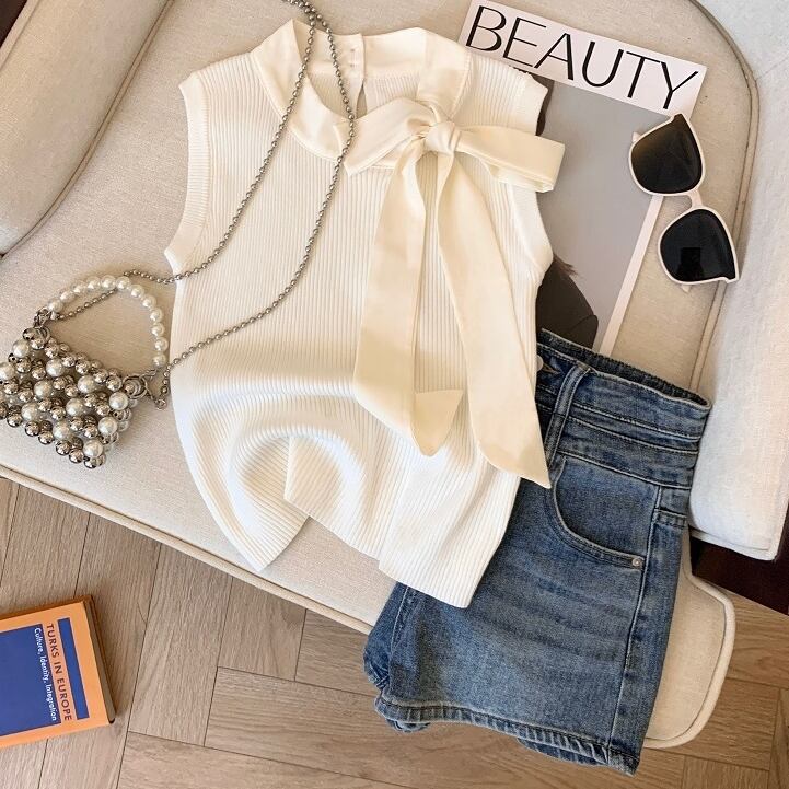 トップス ノースリーブ クルーネック リボン りぼん プルオーバー ミディアム丈 可愛い かわいい 大人可愛い きれいめ 綺麗 シンプル 上品 おしゃれ レトロ かっこいい カジュアル こなれ感 個性的 主役級 存在感 抜け感 春 夏 ベーシック ナチュラル キュート フェミニン ガーリー 無地 女性用 レディース ママ OL 通勤 オフィス 学生 通学 デート お出かけ お泊まり 女子会 旅行 カフェ ショッピング コンパ 普段使い デイリー イベント 着回し 重ね着 ワンサイズ トレンド モテ