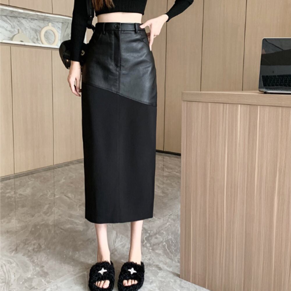 ミディアムスカート タイトスカート ミディアム丈 きれいめ ボトムス Iライン コーデ レザースカート 切り替えデザイン 無地 レディース 上品 通勤 オフィス 着痩せ ポイント消化 夏 秋 S M L XL 2XL ブラック