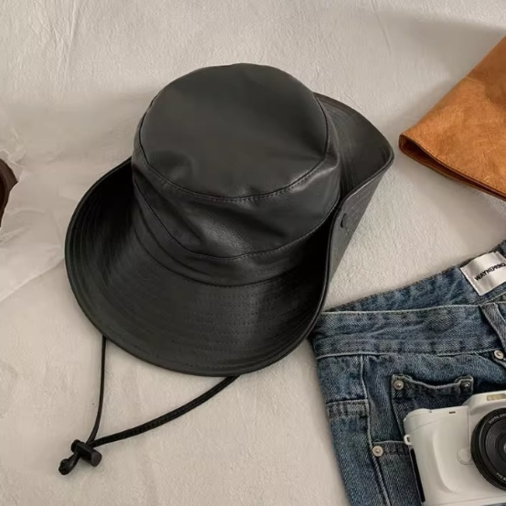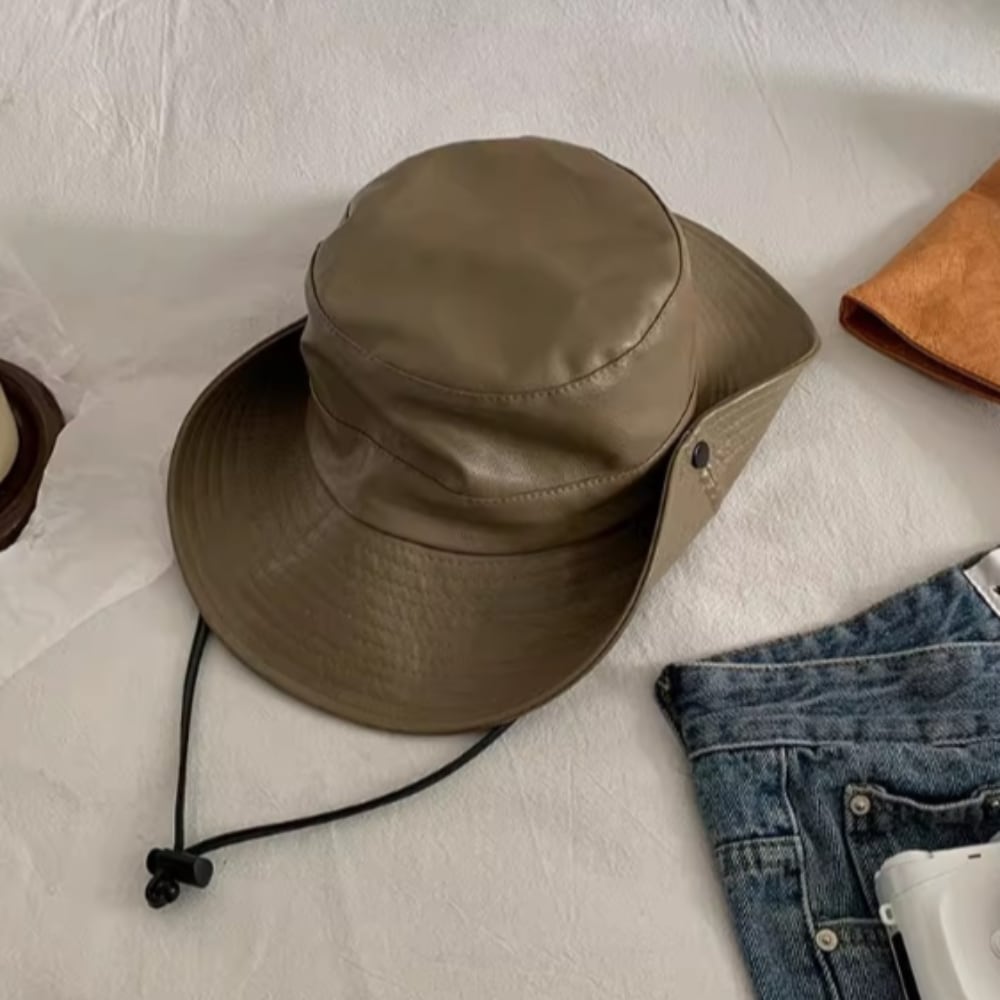 このハットは、フェイクレザーの上品な質感と、日焼け防止機能が特徴です。シンプルな無地スタイルは、アウトドアやお出かけ、リゾートなど様々なシーンにぴったり。あご紐付きデザインで、風が強い日でも安心してお使いいただけます。紫外線カット効果もあり、しっかりと日差しをブロックしてくれます。