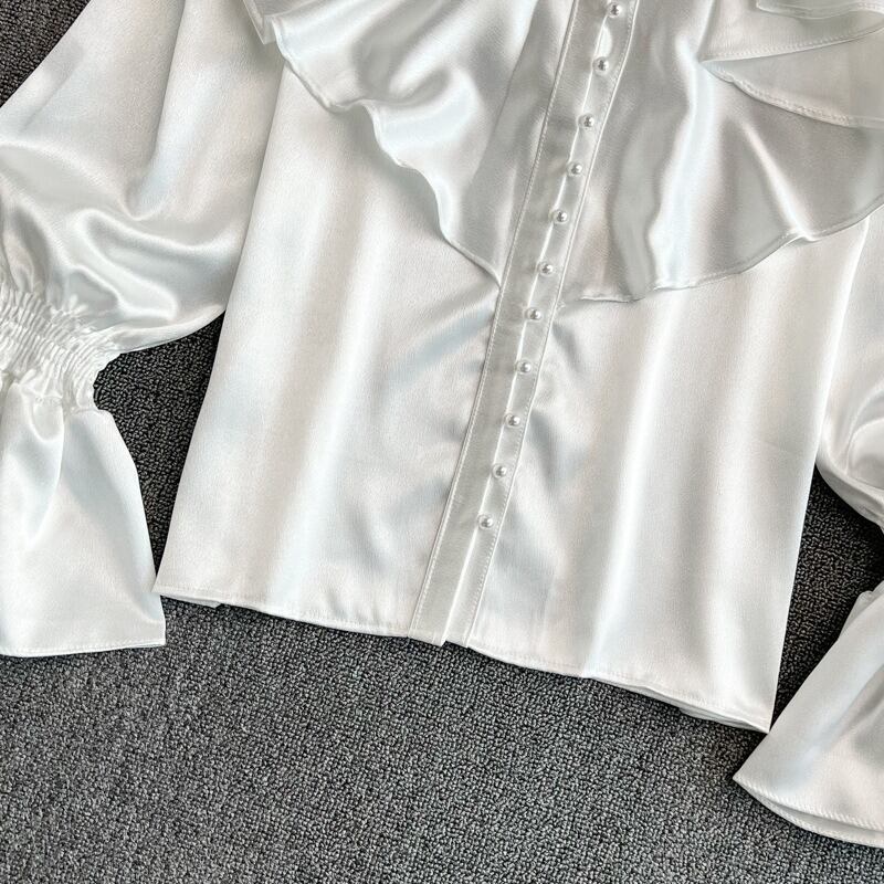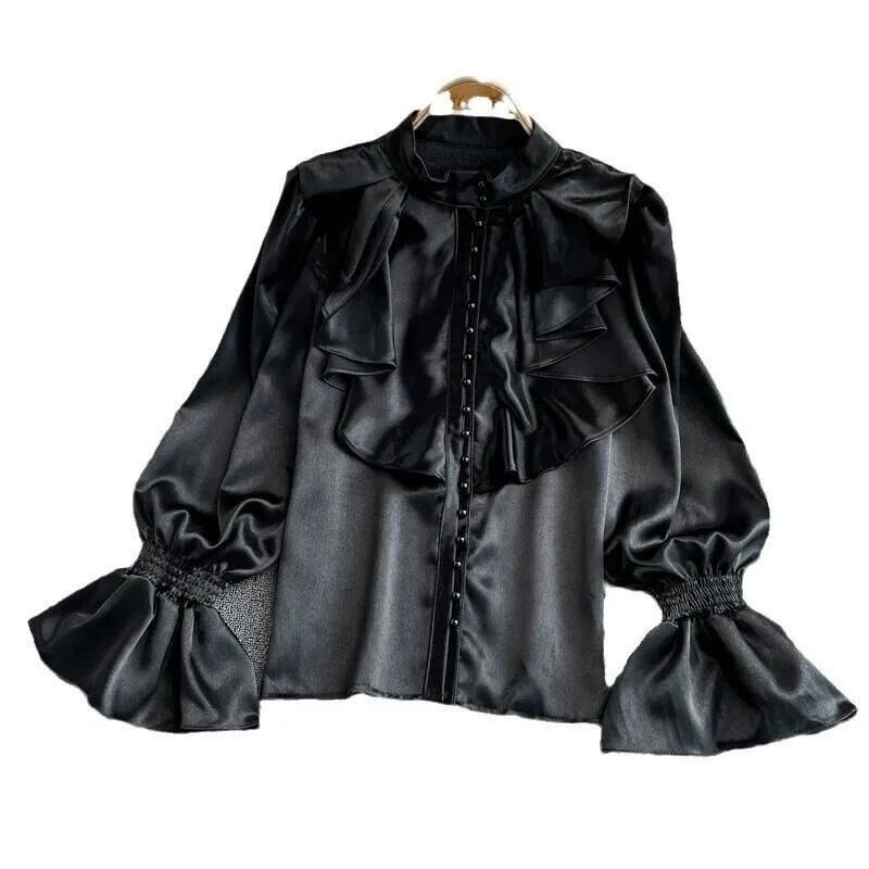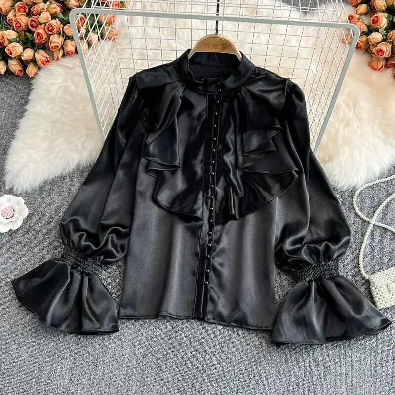 レディース トップス シャツ 長袖 スタンドカラー フリル サテン 大人可愛い きれいめ おしゃれ かっこいい レトロ ガーリー クール 都会的 無地 春 秋 通勤 デート お出かけ お泊まり イベント 旅行 レストラン 公園 女子会 休日 ホテル ショッピング コンサート ライブ カフェ 韓国 コーデ 楽ちん プレゼント 普段使い 着回し モテ インスタ映え フリーサイズ ワンサイズ ホワイト ブラック アプリコット