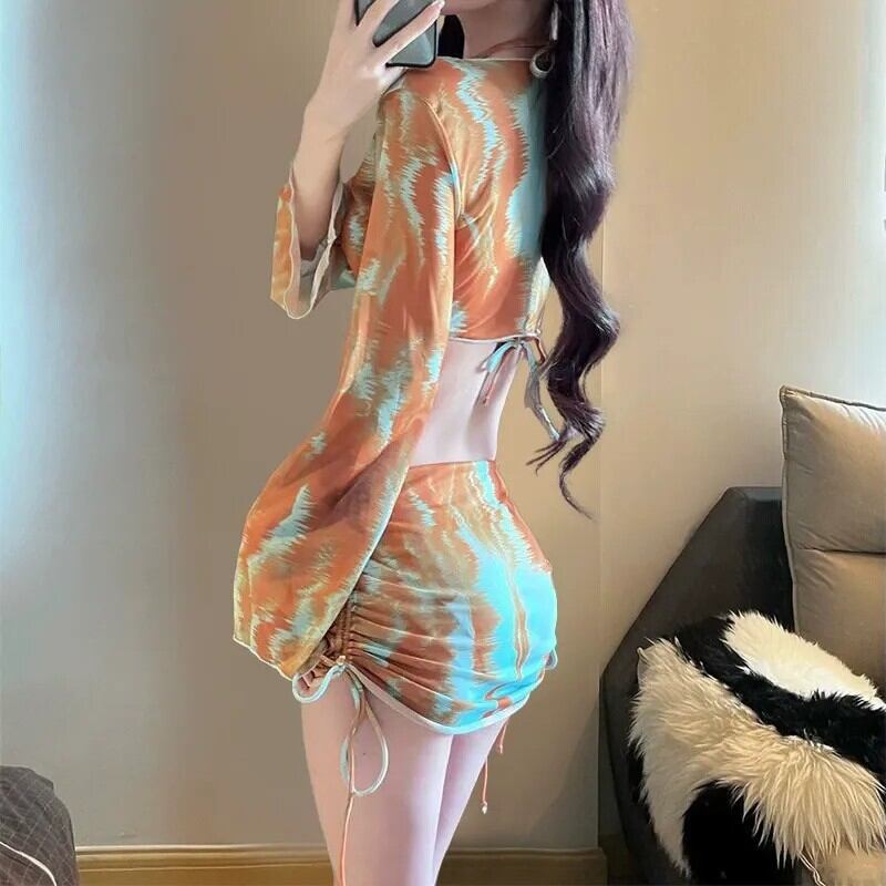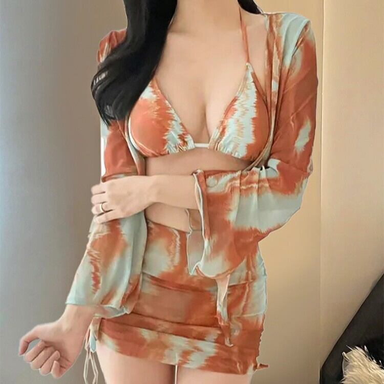 4点セット 水着 レディース 三角ビキニ パッド付き 長袖 ノースリーブ 大人可愛い きれいめ 華やか 大人っぽい おしゃれ お洒落 ガーリー クール かっこいい セクシー プリント リゾート 旅行 温泉 プール 夏 海 ビーチ 美脚 韓国 高見え 格上げ モテ 背中見せ インスタ映え 大きい M L XL オレンジ
