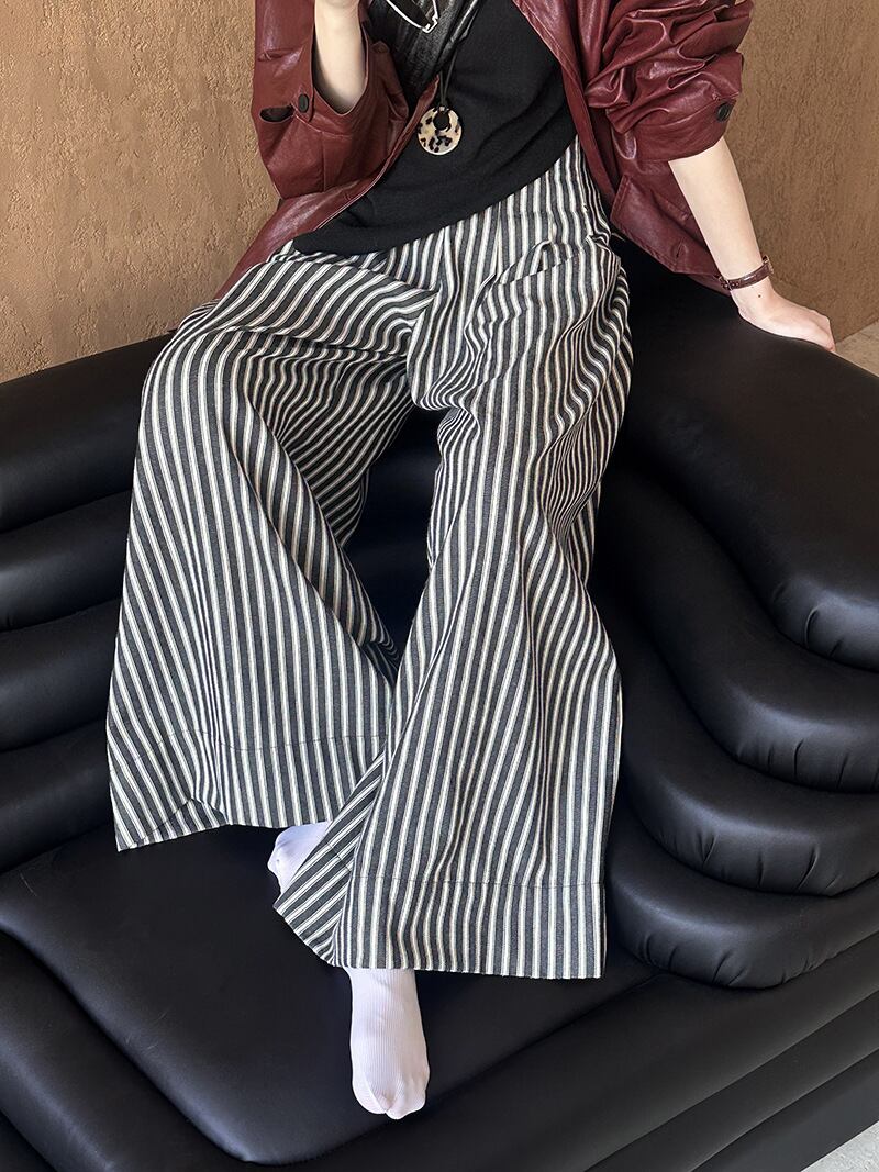 春秋の装いにすっと馴染む、丈長シルエットのワイドパンツです。ほどよくルーズなラインとストライプ柄が縦の流れを強調し、脚をまっすぐ美しく見せてくれます。