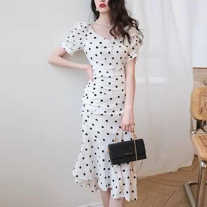 こちらのレディース ワンピースは、大人可愛い魅力を引き立てるおしゃれなアイテムです!パフスリーブとVネックデザインが女性らしさを演出し、フィッシュテールの形状が動くたびに華やかな印象を与えます。ドット柄がレトロでガーリーな雰囲気を醸し出し、通勤やデート、お出かけなど多彩なシーンで活躍します。春夏にぴったりなシフォン素材は、軽やかな着心地で快適さも抜群。
