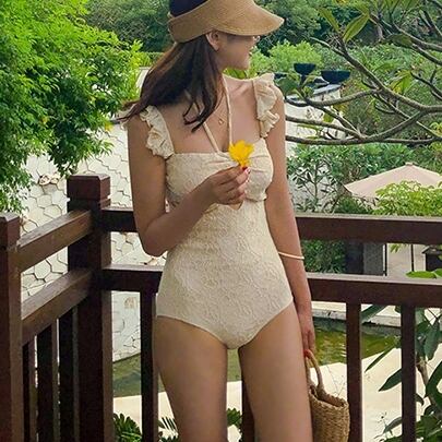 ホルダーネックデザインとカットアウトが魅力的なこの水着は、フリル付きでフェミニンな印象を与えつつ、パッド付きで安心感もバッチリ。