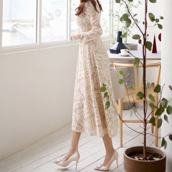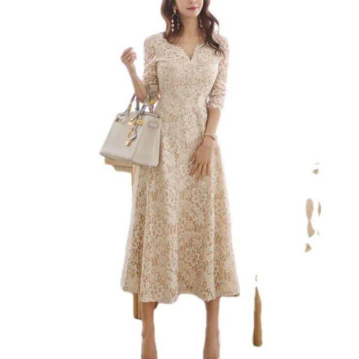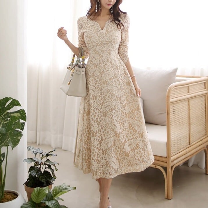 結婚式、二次会、披露宴、演奏会と、幅広いフォーマルなイベントシーンで活躍する一着です。エレガントながらも、大人可愛い印象を与えるレースとVネックデザインが特徴で、華やかさと女性らしさを引き立てます。ロング丈と7分袖のスタイルは、シーズンを問わずおしゃれに着こなせます。