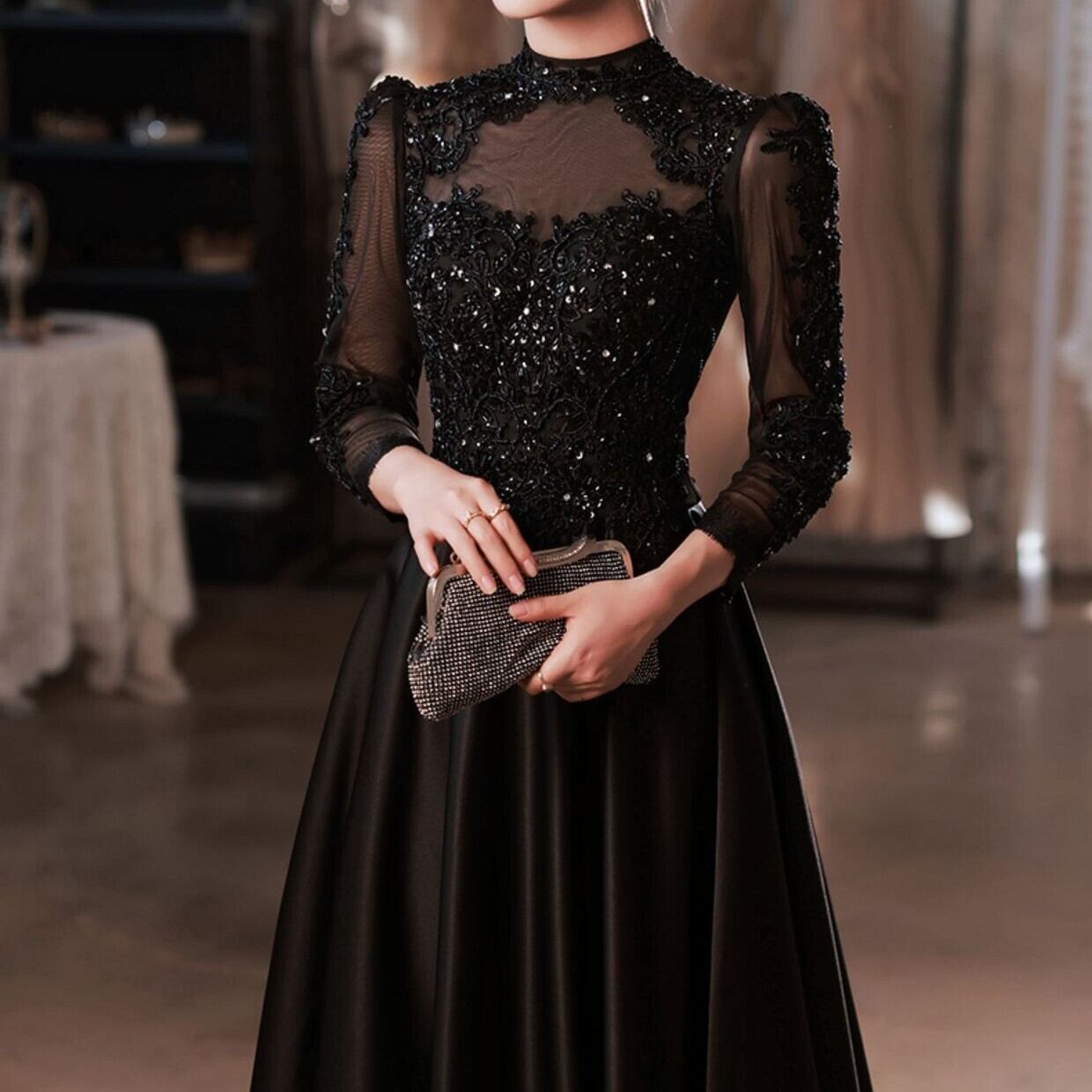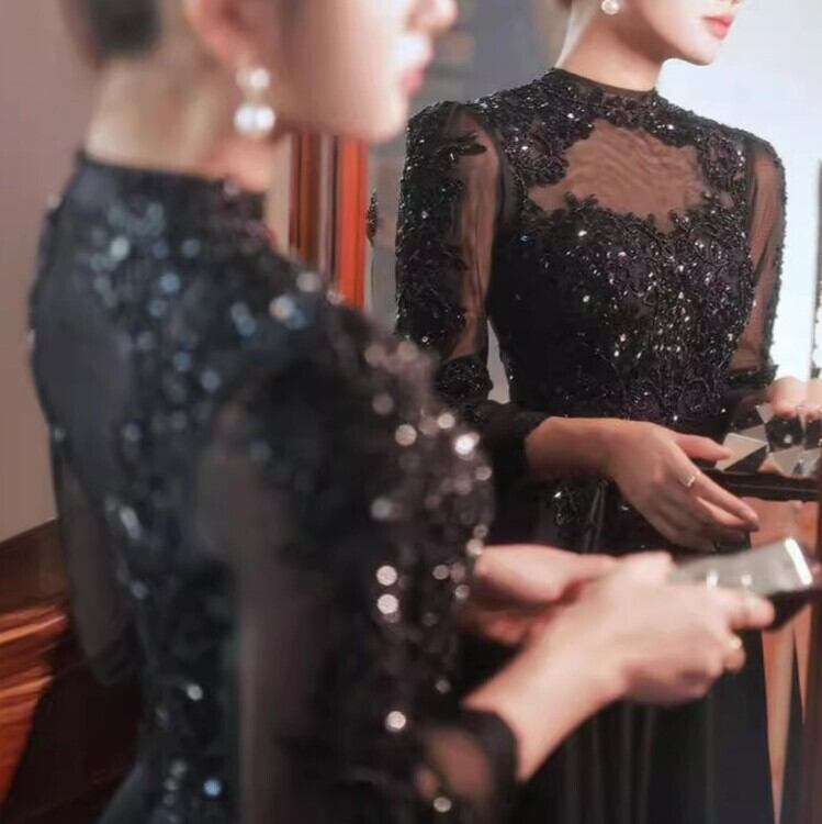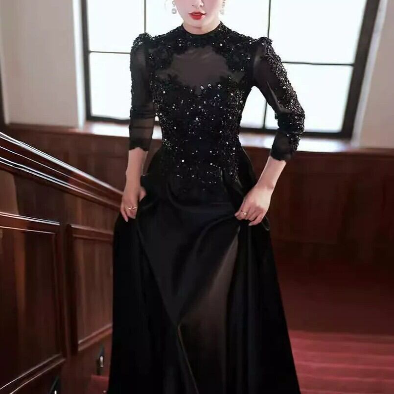 ドレス ワンピース ウェディング パーティー 結婚式 二次会 披露宴 演奏会 発表会 ステージ 舞台 フォーマル ロング 長袖 スタンドカラー イブニング ハイウエスト きれいめ 大人可愛い 上品 おしゃれ かっこいい ガーリー クール エレガント 主役級 存在感 ゴージャス 華やか 無地 イベント ホテル レストラン 韓国 脚長 高見え 格上げ 女子会 春 夏 秋 冬 シーズンレス XS 2XL 3XL 4XL 大きい S M L XL ブラック