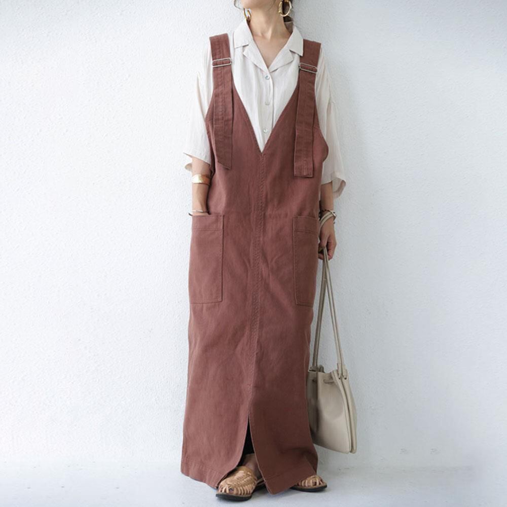 ワンピース ロングワンピース ジャンパースカート フロントスリット ポケット ロング丈 可愛い かわいい 大人可愛い きれいめ シンプル 上品 おしゃれ レトロ かっこいい カジュアル こなれ感 個性的 主役級 ラフ 存在感 抜け感 オールシーズン ベーシック ナチュラル メンズライク 無地 女性用 レディース OL 通勤 オフィス 学生 通学 デート お出かけ お泊まり 女子会 旅行 カフェ ショッピング コンパ 普段使い デイリー イベント 脚長 美脚 ワンサイズ トレンド モテ ゆったり 楽ちん