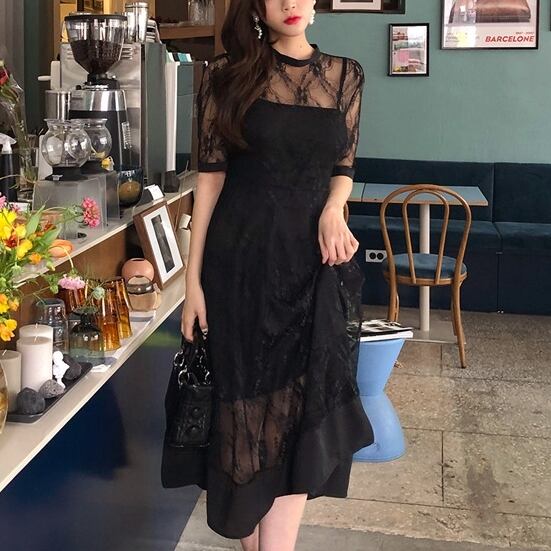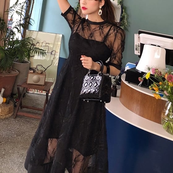このロングワンピースは、5分袖とクルーネックのデザインが特徴で、シースルーのアクセントがエレガントな印象を与えます。
