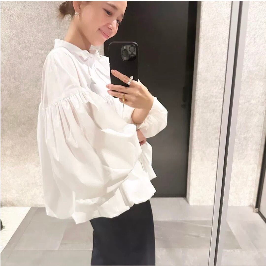 肌ざわりの良いホワイトのブラウスは、大人可愛いスタイルを演出するためにデザインされた一枚です。袖はボリュームのあるフレアスリーブで、リボン付きのスタンドカラーがアクセントとなり、女性らしさを引き立てています。普段使いにも、お出かけや女子会、旅行など、幅広いシーンで活躍すること間違いなしです。