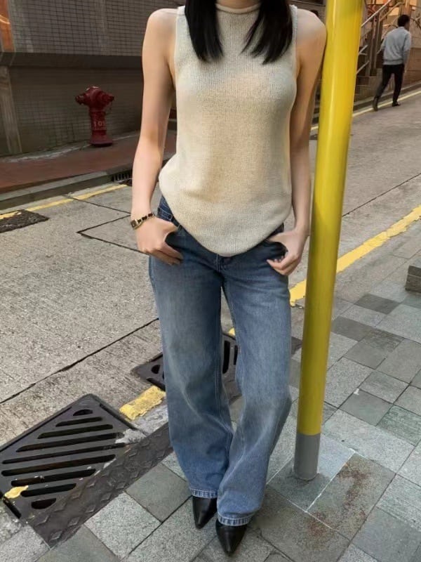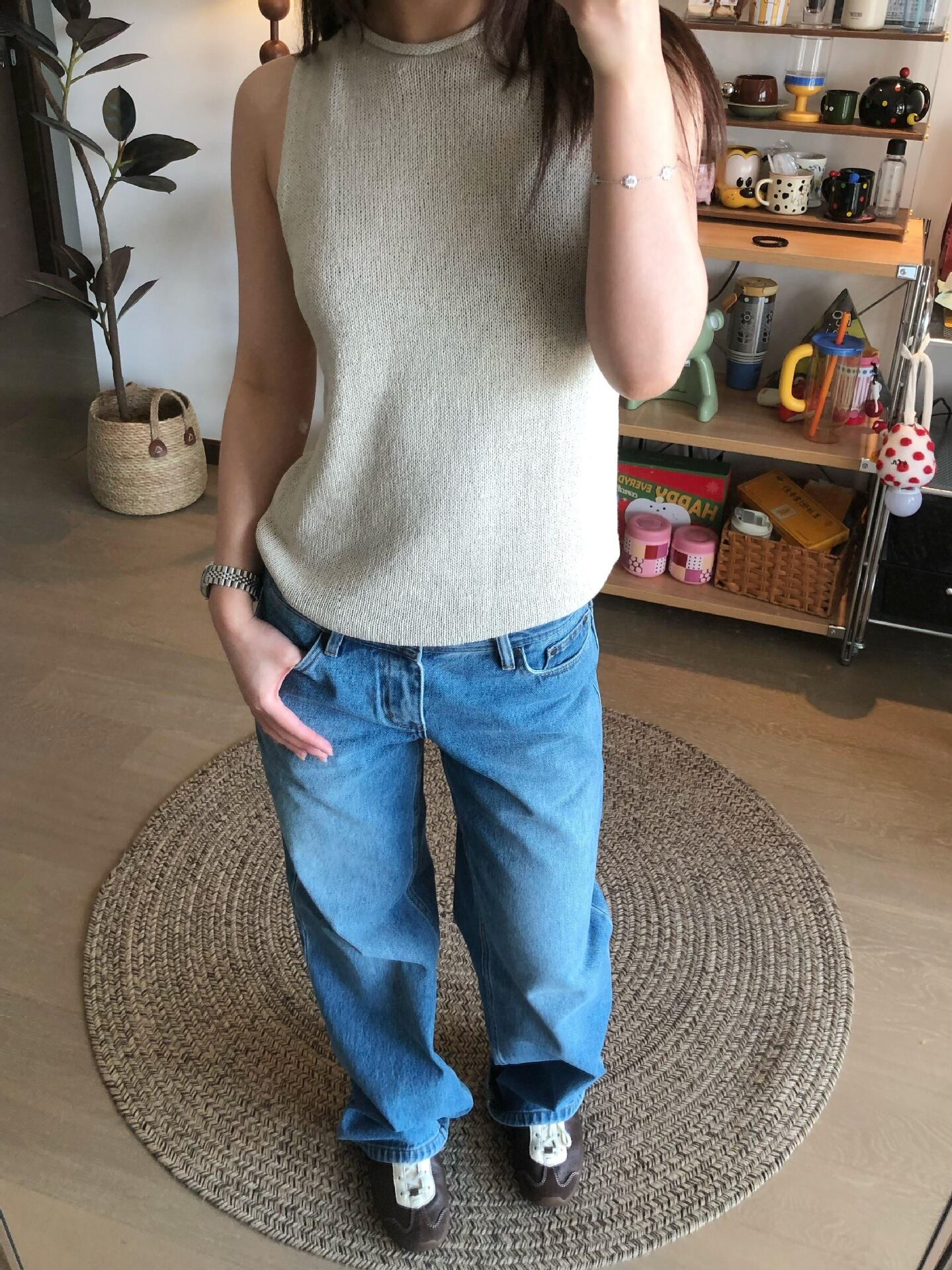脚のラインをまっすぐ見せるストレートデニムは、ほどよい丈感とブルーの風合いでこなれた雰囲気を楽しめます。