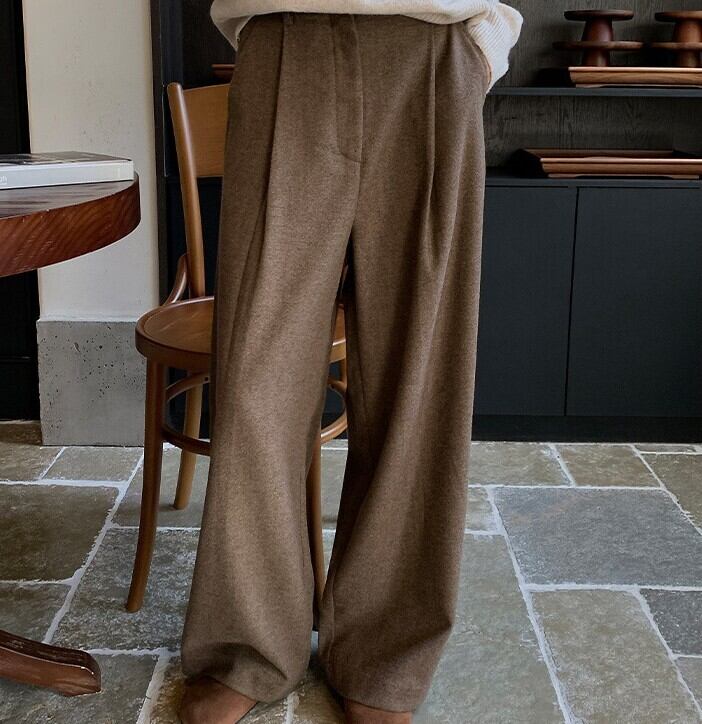 すとんと落ちるシルエットが美しいワイドパンツは、タック入りのハイウエスト仕様で脚長効果を自然に引き立てます。
