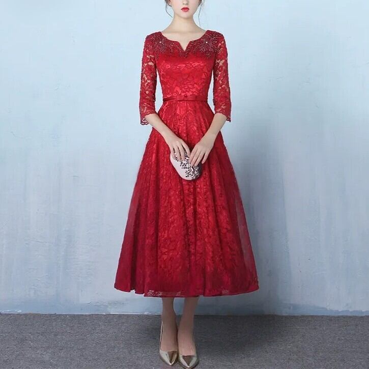 このおしゃれで上品なドレスは、ウェディングやパーティー、二次会、披露宴、演奏会、発表会などのフォーマルなシーンで大活躍。7分袖とVネックデザインが美しいシルエットを作り出し、女性らしさを引き立てます。ブラックとレッドのシンプルな無地仕立ては、シーンを選ばず大人可愛い印象を与えることができます。