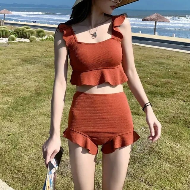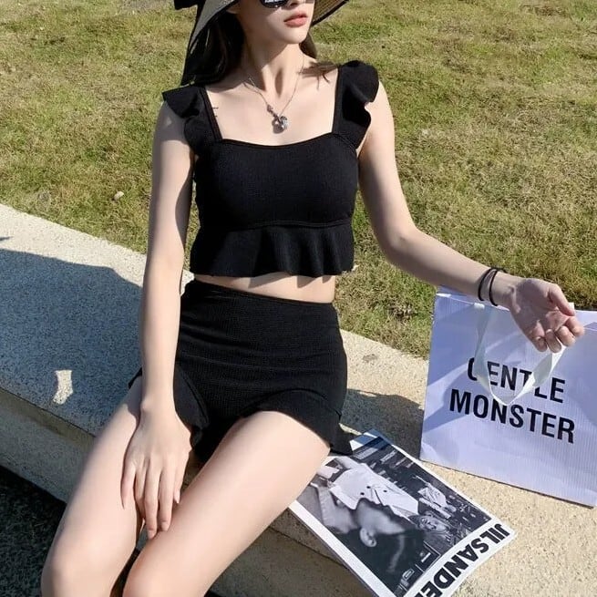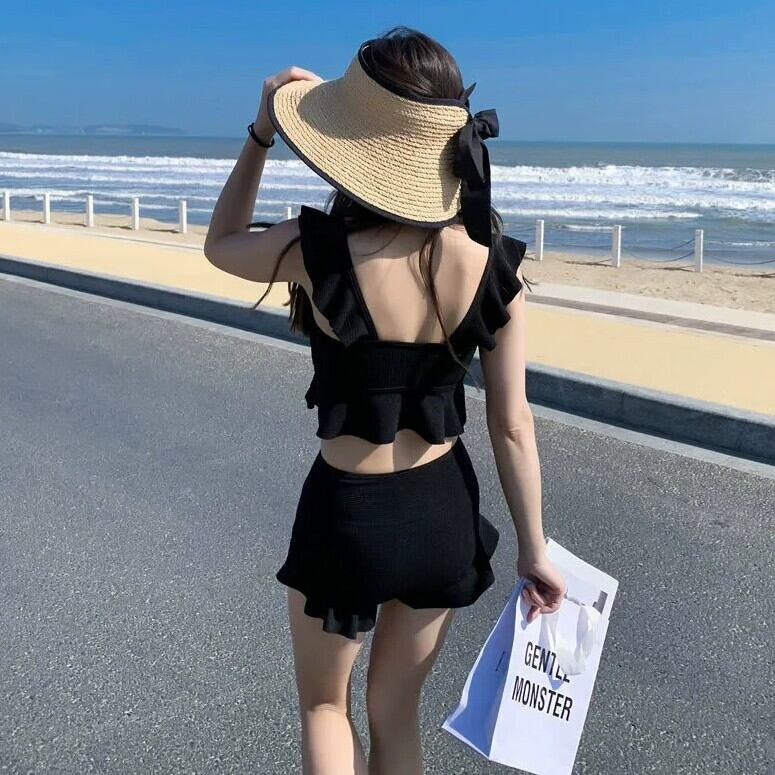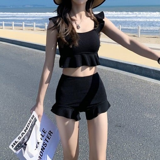 水着 ビキニ レディース 短パン ノースリーブ フリル セット ツーピース 上下セット 大人可愛い きれいめ 華やか 大人っぽい おしゃれ お洒落 ガーリー クール かっこいい セクシー 無地 リゾート 旅行 温泉 プール 夏 海 ビーチ 美脚 韓国 高見え 格上げ モテ 背中見せ インスタ映え 大きい M L XL ブラック キャラメル