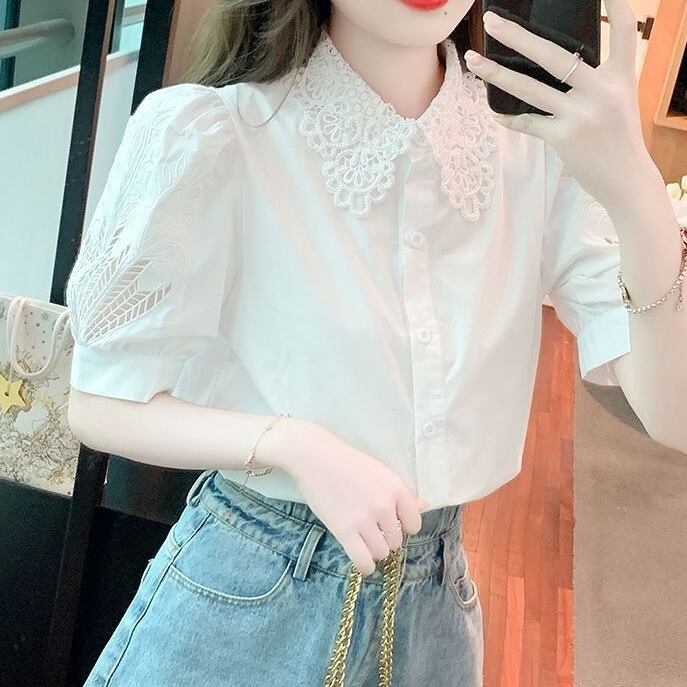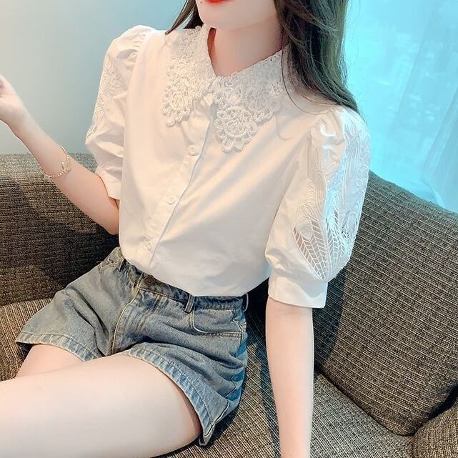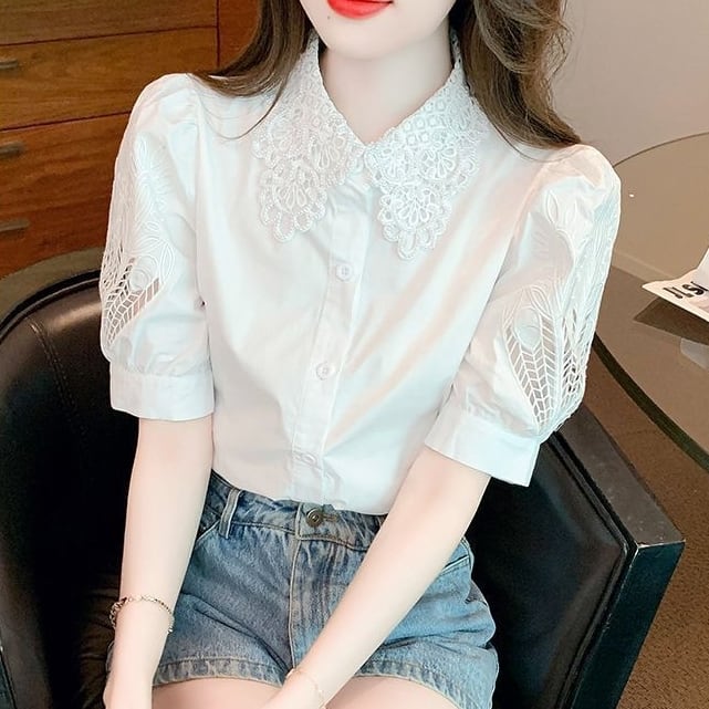 トップス シャツ 5分袖 襟付き パフスリーブ 前開き ボタン ミディアム丈 刺繡 可愛い かわいい 大人可愛い きれいめ シンプル 上品 おしゃれ レトロ かっこいい カジュアル こなれ感 個性的 主役級 存在感 抜け感 春 夏 ナチュラル ベーシック エレガント フェミニン 無地 女性用 レディース ママ OL 通勤 オフィス 学生 通学 デート お出かけ お泊まり 女子会 旅行 カフェ ショッピング コンパ 普段使い デイリー イベント 着回し 重ね着 S M L XL 2XL モテ トレンド