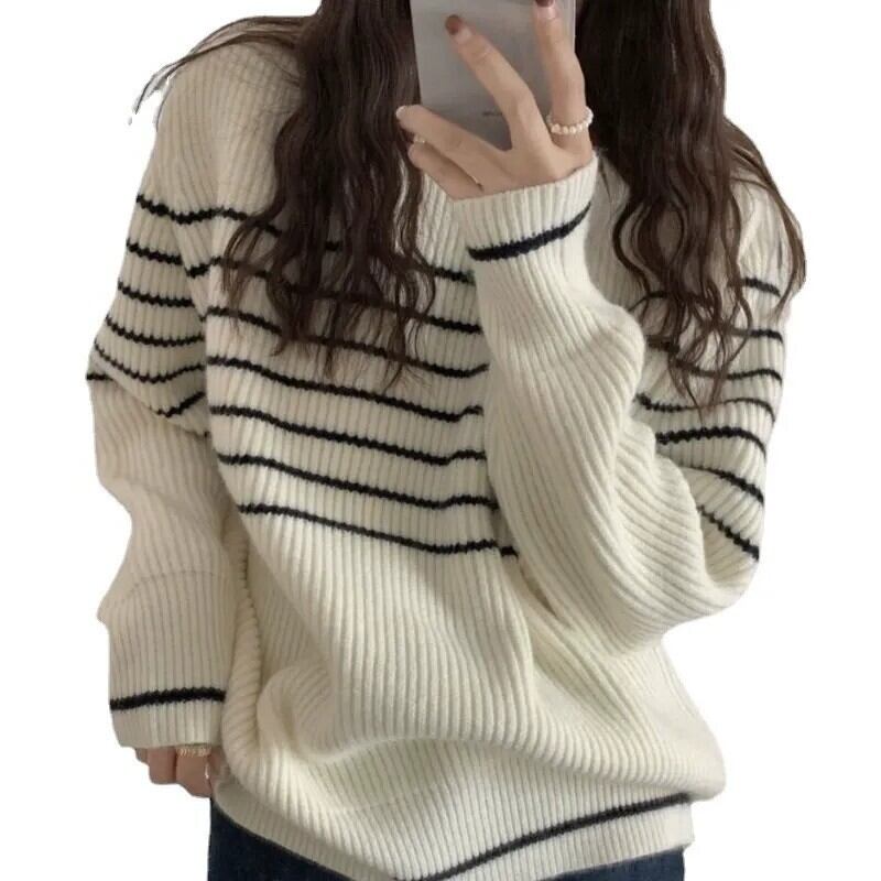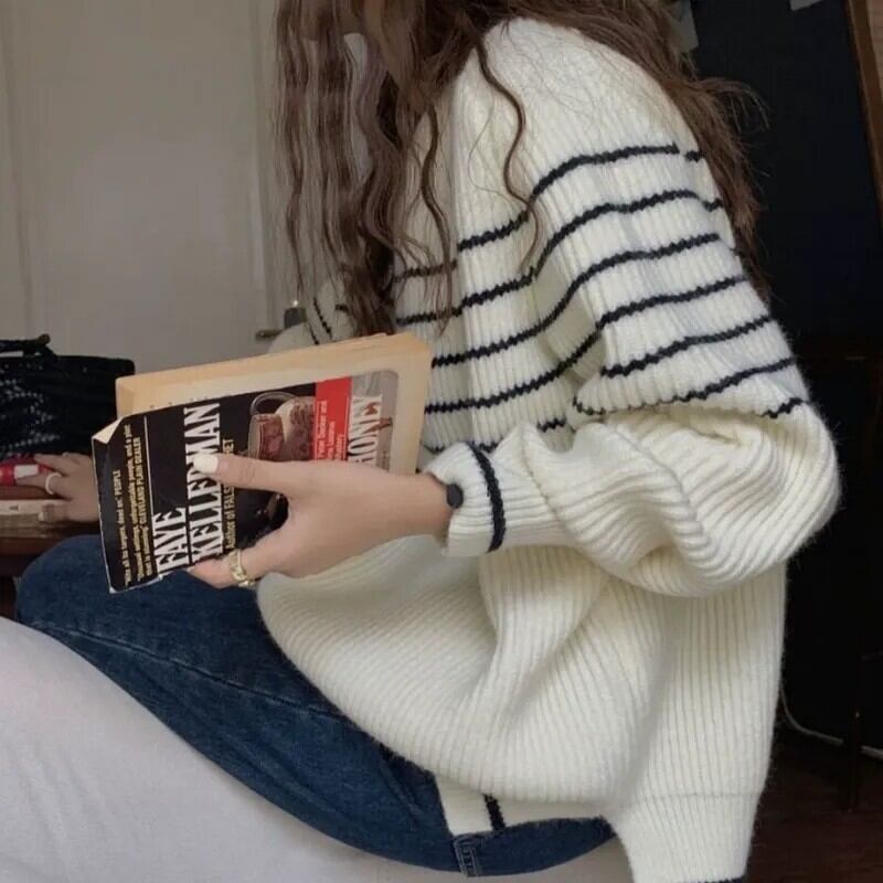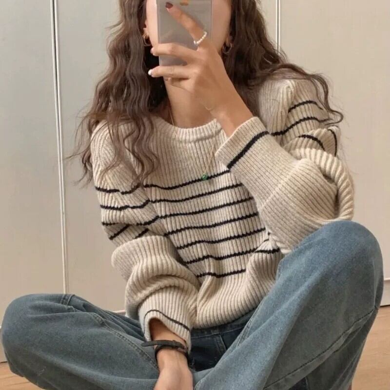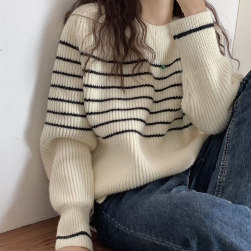 レディース トップス ニット 長袖 ラウンドネック 大人可愛い きれいめ おしゃれ かっこいい レトロ ガーリー クール ナチュラル ストライプ 秋 冬 通勤 デート お出かけ お泊まり イベント 旅行 レストラン 公園 女子会 休日 ホテル ショッピング コンサート ライブ カフェ 韓国 コーデ 楽ちん 暖かい プレゼント 普段使い 着回し 清楚 インスタ映え フリーサイズ ワンサイズ ベージュ アプリコット ネイビー