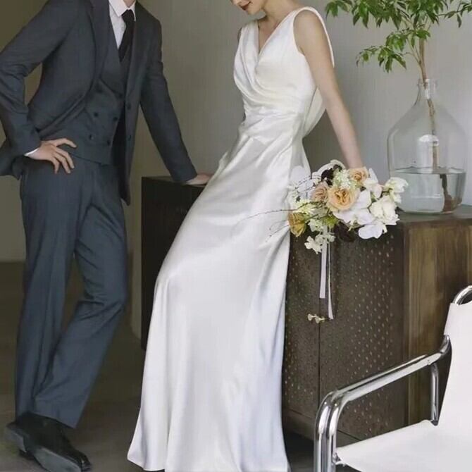 ドレス ワンピース ウェディングドレス ウェディング 結婚式 二次会 披露宴 ロング ノースリーブ Vネック サテン きれいめ 大人可愛い 上品 おしゃれ かっこいい ガーリー クール エレガント 主役級 存在感 清楚 セクシー 華やか 無地 ホテル レストラン 韓国 高見え 格上げ 光沢感 春 夏 秋 冬 シーズンレス XS S M L XL 2XL ホワイト