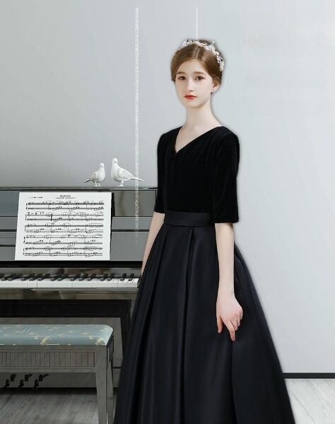 キッズ ガール 子供服 ワンピース ドレス ロング 5分袖 Vネック 襟なし Aライン フレア 切り替え ファスナー 切り替えデザイン かわいい シンプル 上品 おしゃれ エレガント 主役級 存在感 キュート 無地 秋 冬 誕生日 発表会 お出かけ パーティー イベント レストラン 発表会 モノトーン コーデ 黑 ブラック ベーシックカラー