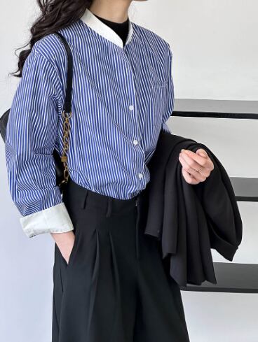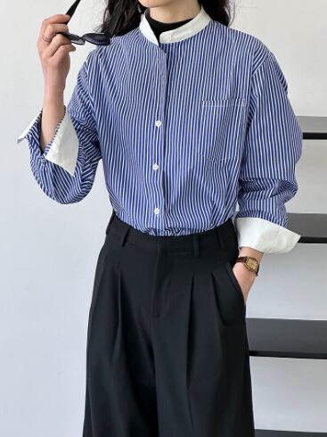 トップス ブラウス 前開き ハーフ 長袖 クルーネック ボタンダウン ストレート 前開き ボタン 切り替えデザイン 薄手 コットン かわいい 大人可愛い シンプル カジュアル 上品 おしゃれ ラフ ストライプ 春 秋 授業参観 ママ 10代 20代 30代 40代 オフィス OL 通勤 学生 学校 通学 デート お出かけ お泊まり 公園 女子会 ショッピング お花見 重ね着 韓国 楽ちん 普段使い 着回し 清楚 定番 M L 白青