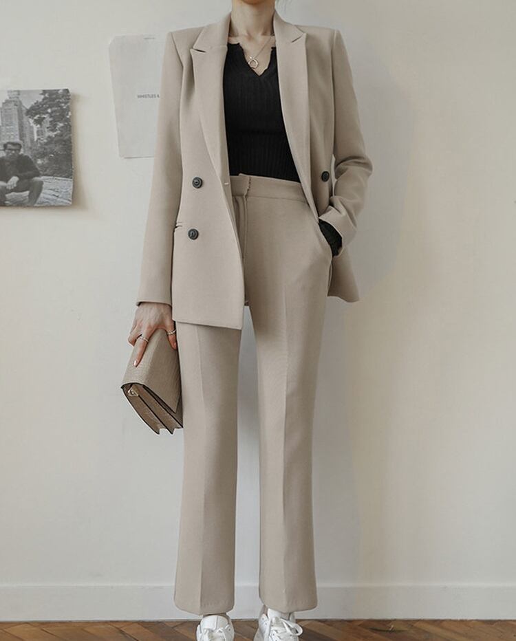 2点セット セットアップ スーツ ジャケット 長袖 襟付き 前開き ダブルボタン クロップドパンツ ハイウエスト ポケット 可愛い かわいい 大人可愛い きれいめ シンプル 上品 おしゃれ レトロ かっこいい カジュアル こなれ感 個性的 主役級 存在感 抜け感 オールシーズン ベーシック ナチュラル クール 無地 女性用 レディース ママ OL 通勤 オフィス デート お出かけ お泊まり 女子会 旅行 カフェ ショッピング コンパ 普段使い デイリー イベント 着回し 脚長 S M L XL 定番 モテ