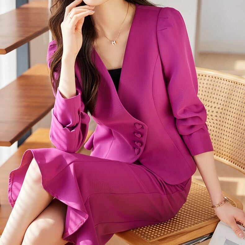 このレディース2点セットは、上品でありながらも、大人可愛いデザインが魅力のジャケットとスカートの組み合わせです。Vネックのスリムシルエットが美しいラインを作り出し、ボタンのディテールが絶妙なアクセントになっています。フォーマルなシーンからカジュアルなデートシーンまで、幅広いお出かけに活躍するアイテムです。都会的で洗練された印象を与えるため、女子会やホテルでのディナーにも最適。