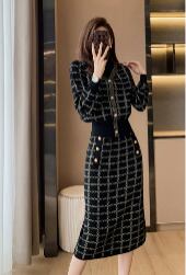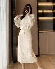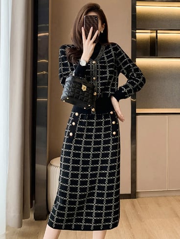 デザイン:膝下丈のスカートと、長袖のカーディガンがセットになったおしゃれなツーピース。