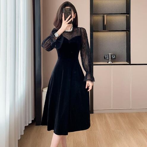 レディース ドレス ドレス ミドル丈 長袖 フレアスリーブ プリンセススリーブ モックネック フレア レース ハイウエスト パッチワーク ジッパー 中厚手 ベルベット かわいい 大人可愛い きれいめ シンプル 上品 おしゃれ エレガント 都会的 ナチュラル 無地 秋 冬 結婚式 バレンタイン 10代 20代 パーティー イベント レストラン ホテル 発表会 コンサート 韓国 美脚 脚長 インスタ映え S M L 黒