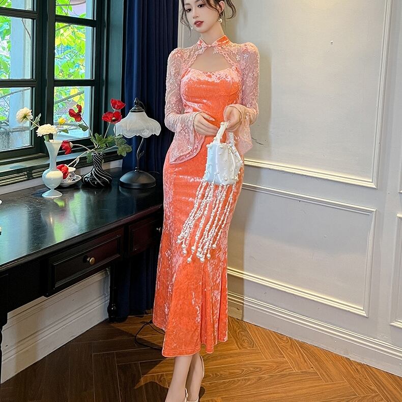 マーメードスカートが美しいシルエットを作り出し、ベルベット生地が滑らかな肌触りを実現します。