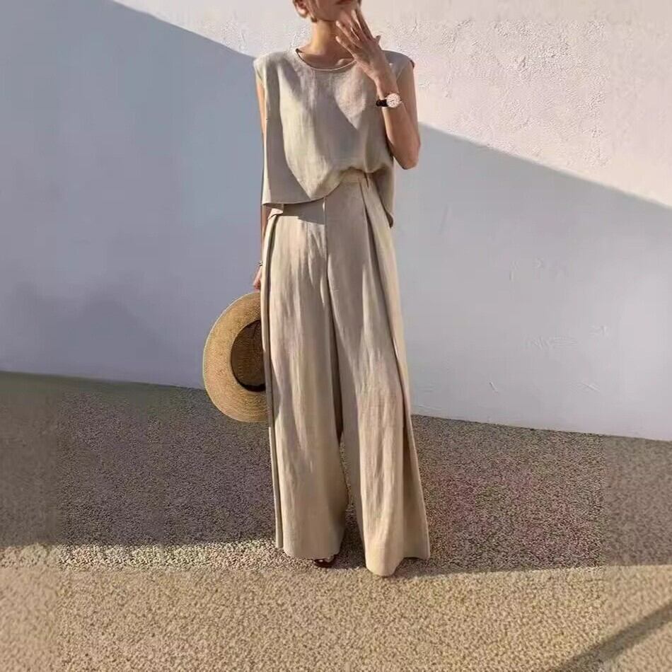 2点セット レディース トップス パンツ ワイドパンツ ノースリーブ ラウンドネック ハイウエスト 大人可愛い きれいめ おしゃれ かっこいい ガーリー ルーズ クール ナチュラル 無地 春 夏 通勤 デート お出かけ お泊まり イベント 旅行 レストラン 女子会 休日 ホテル ショッピング コンサート ライブ カフェ 韓国 コーデ 楽ちん プレゼント 脚長 普段使い 着回し モテ インスタ映え XS S M L XL 2XL 小さいサイズ 大きいサイズ アプリコット