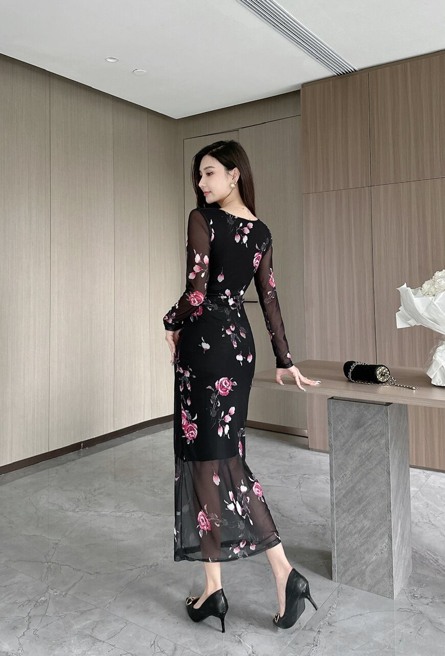 レディース ワンピース ミモレ ロング 長袖 Vネック タイト スリム 細身 Iライン 透け感 シースルー 大人可愛い きれいめ 上品 おしゃれ エレガント 存在感 キュート シック 花柄 春 秋 デート お出かけ パーティー イベント 旅行 レストラン 女子会 休日 バカンス ホテル S M L XL ブラック ベーシックカラー 大人カラー