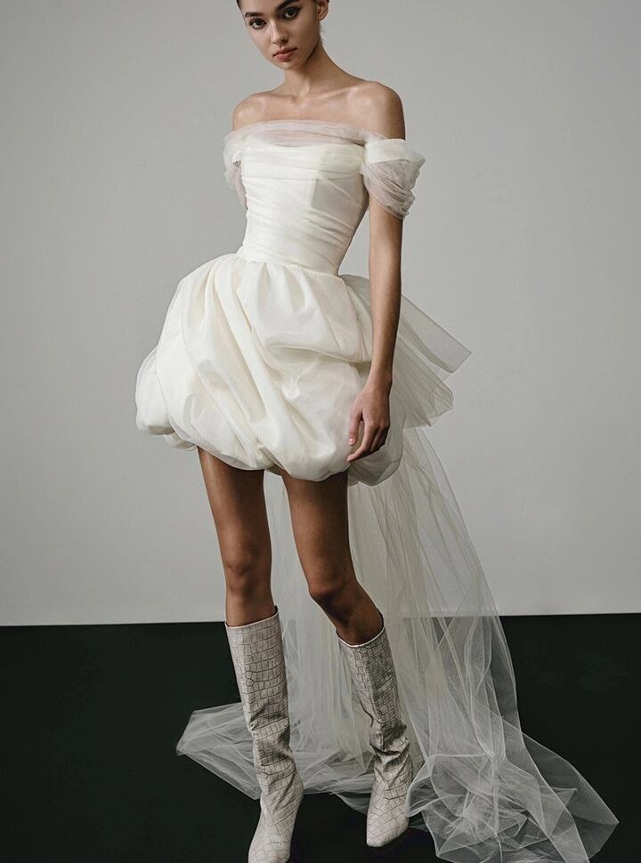 このウエディングミニドレスは、オフショルダーとハイウエストのデザインが絶妙に融合した、華やかでエレガントな一着です。