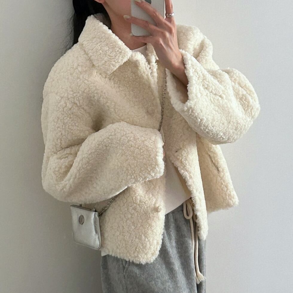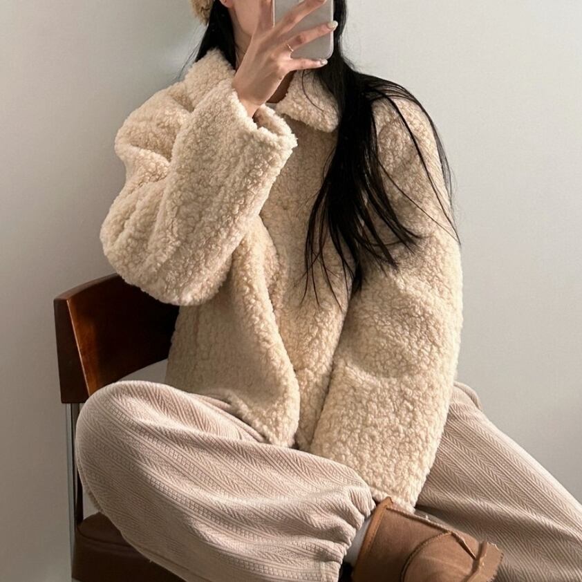 「ふわふわ」のボア素材が魅力のショート丈コートは、シンプルでありながら上品なデザインが特徴です。