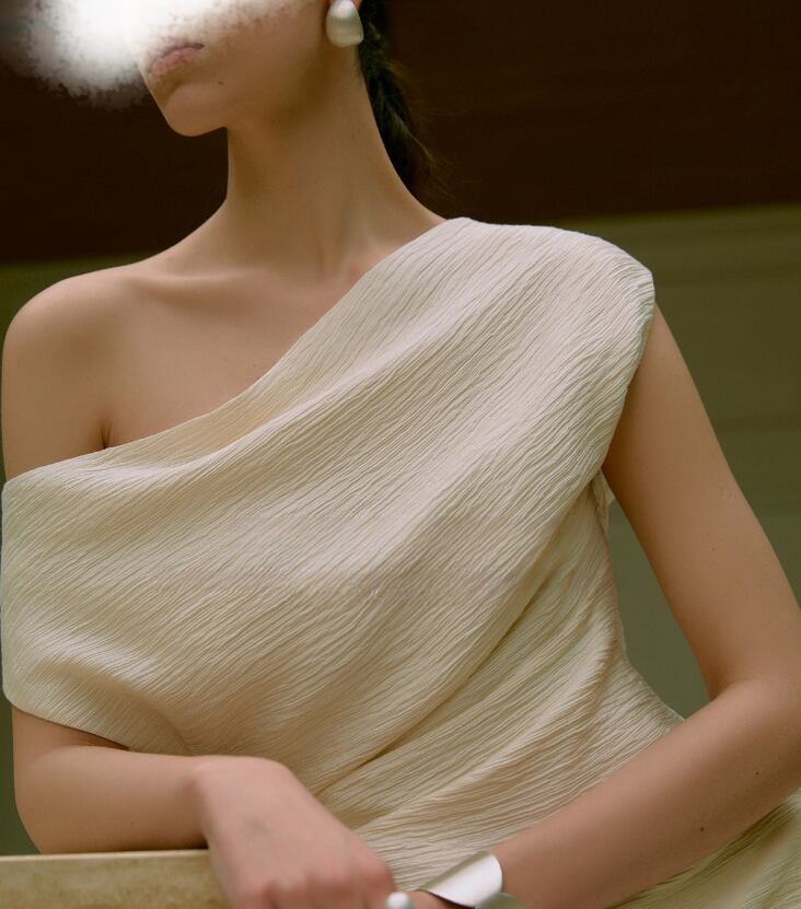 タイトなシルエットが魅力のオフショルダートップスで、抜け感のある大人スタイルに。