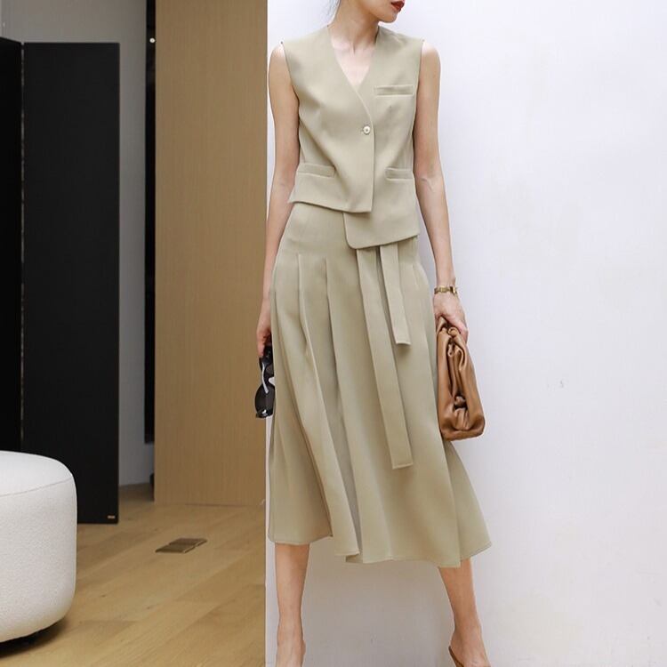 春夏のスタイルにぴったりな、レディーススカートトップスベストスーツが登場!ノースリーブデザインは涼しげで、都会的な印象を与えます。美しいシルエットとさりげないポケットが特徴のこのスーツは、フォーマルな場面からカジュアルなデートまで幅広く活躍します。無地のブラックとカーキの二色展開で、シーンに合わせた着回しが可能です。大人可愛いスタイルで、清楚さとおしゃれさを兼ね備え、インスタ映えも期待できるアイテムです!