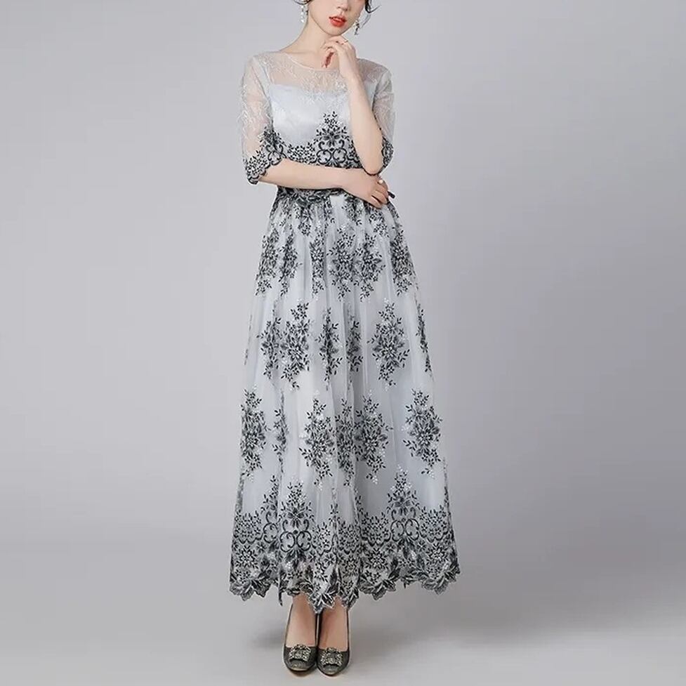 ドレス 5分袖 フレア チュール 刺繍 モノトーン ハイウエスト ロング丈 透け感 シアースリーブ シースルーレース ワンピース レディース パーティードレス お呼ばれドレス オシャレ きちんと感 キレイめ 上品 フェミニン 華やか フォーマル 大人可愛い エレガント ガーリー 結婚式 二次会 お呼ばれ スタイルアップ パーティー セレモニー オケージョン スマート コンパクト 細見え ロイヤル 大人 セクシー 可愛い レトロ フォーマルドレス 鮮度アップ