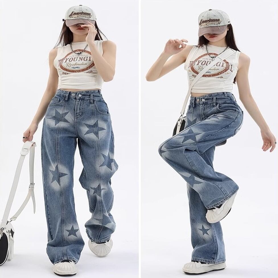 大胆な星柄プリントが視線を引きつける個性派デニムパンツ。全体にヴィンテージ感のあるウォッシュカラーを施しゆるやかに広がるワイドシルエットでストリート感とY2Kテイストを融合。ウエストのアシンメトリーなディテールもこなれ感抜群です。
