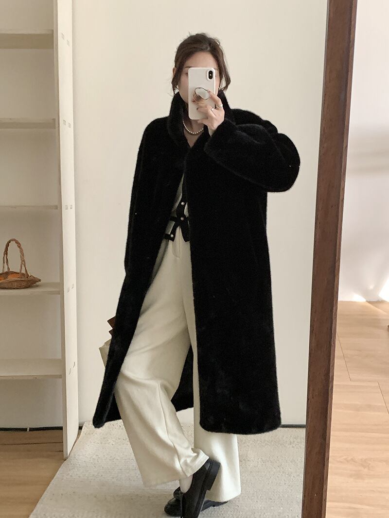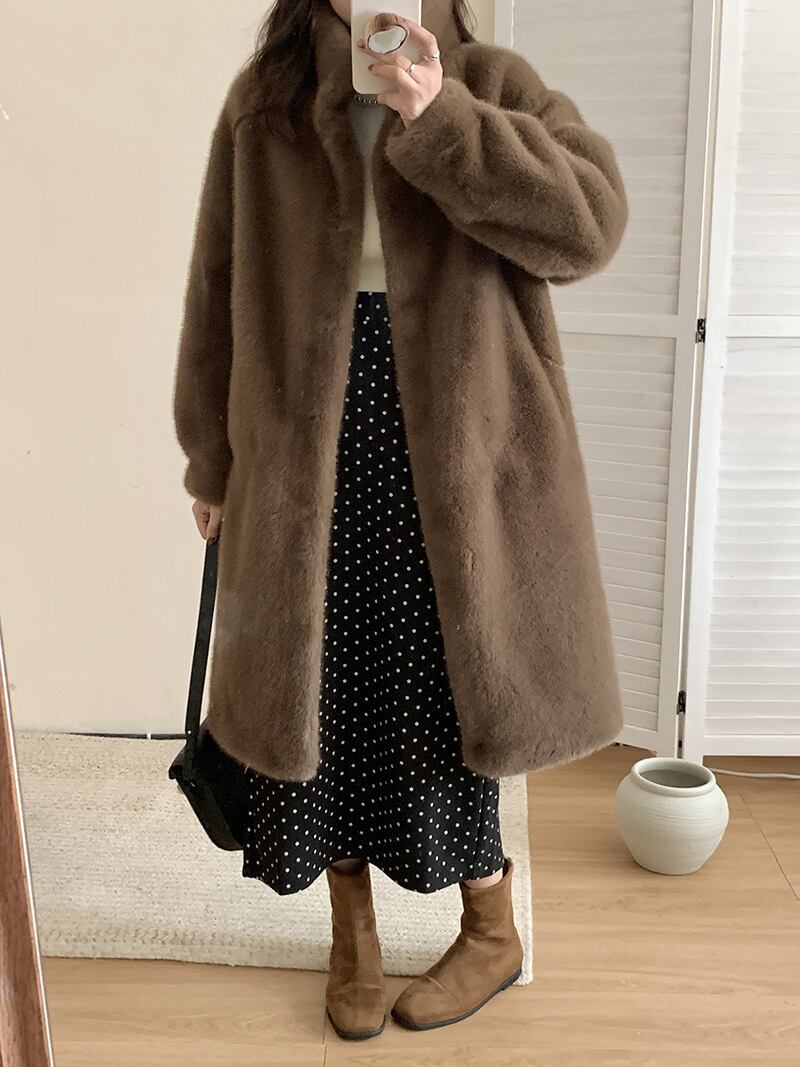大人の女性にぴったりな、ふわふわのフェイクファーコートが登場しました!ロング丈とスタンドカラーのデザインが、シンプルながらも存在感を与え、カジュアルな普段使いからオフィスシーンまで幅広く活躍します。厚手のポリエステル素材は、冬の寒さからしっかりと守りながら、軽やかな着心地を実現。お出かけやイベント、旅行にぴったりの一着です。